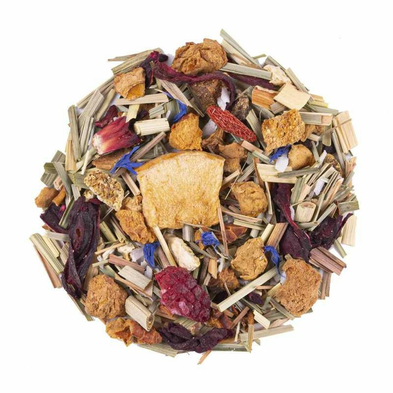 Citronnelle, coco, pomme, hibiscus, coing, écorces de citron, arôme naturel, pomme, baie de goji, framboise (2%), fleurs de bleuet.