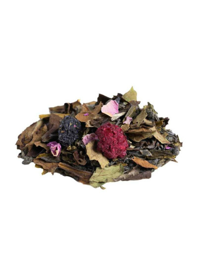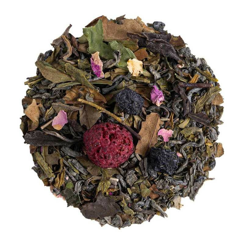 Thé vert China Chun Mee, thé blanc Pai Mu Tan, thé vert China Sencha, arôme naturel, pétales de rose (2%), framboise (2%), aronia, cassis (1%). Mélange premium élaboré avec des ingrédients issus de l'agriculture durable et des arômes naturels.