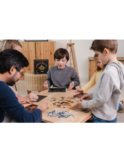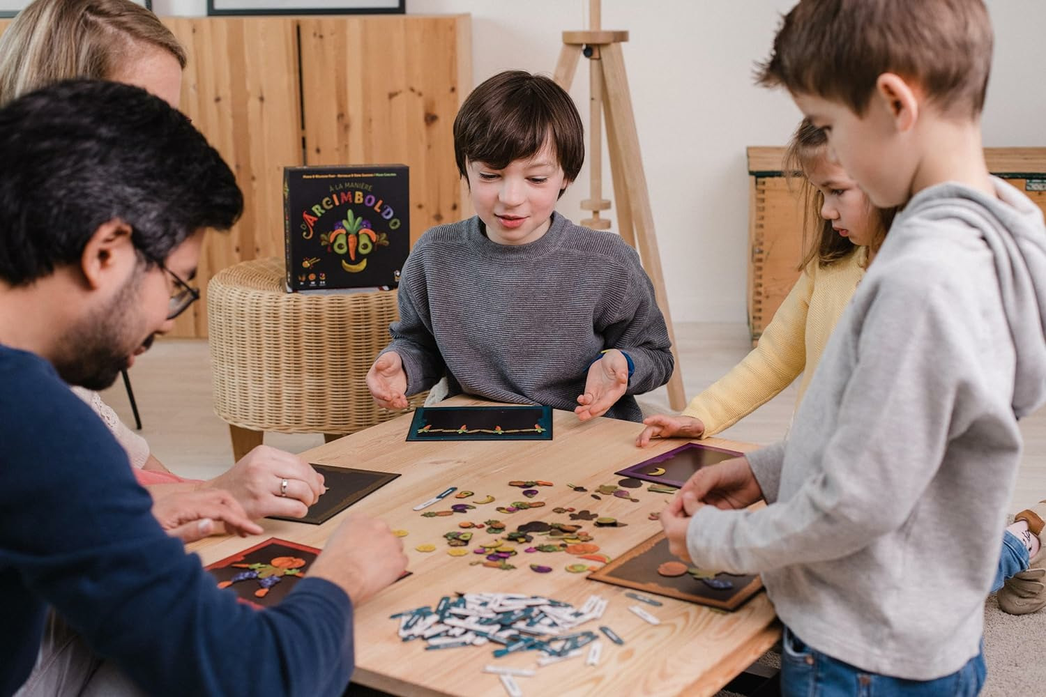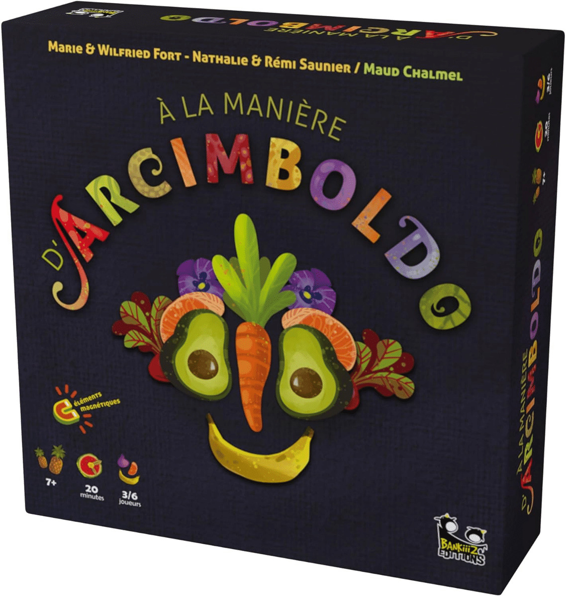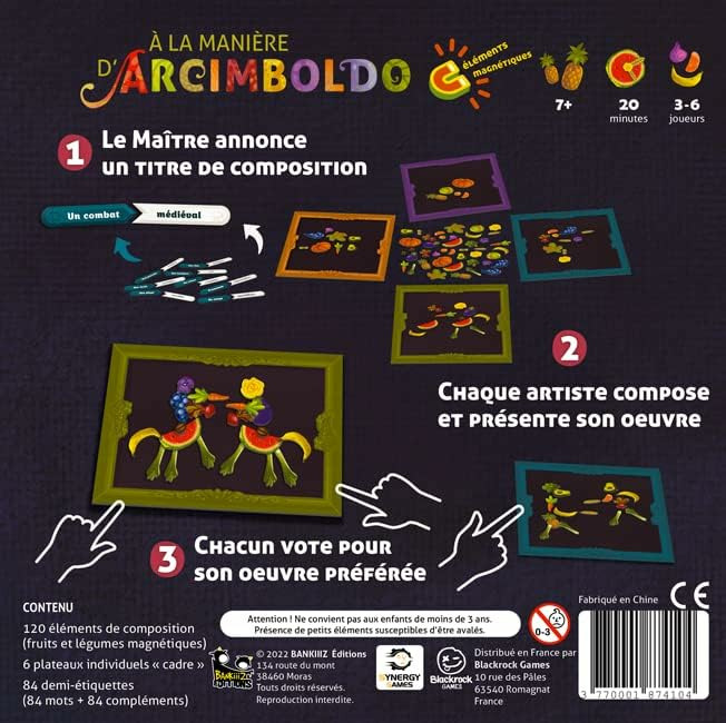 La partie se déroule en tours. Au début d’un tour, le Maître Arcimboldo prend une demi-étiquette nom, puis une demi-étiquette complément. Il les associe à sa guise, les deux demi-étiquettes étant recto-verso. Une fois la combinaison choisie, le Maître annonce le titre et le place à la vue de tous. Les joueurs vont créer des oeuvres à l’aide des éléments magnétiques, fruits, légumes, céréalse et fleurs. Dès qu’un joueur a terminé son œuvre, il pivote son plateau cadre afin que les autres joueurs puissent la visualiser dans le bon sens. Il est temps pour chacun de commenter son œuvre en quelques mots en commençant par le Maître Arcimboldo, puis chaque joueur dans le sens des aiguilles d’une montre. Une fois que chacun a commenté son œuvre, les joueurs votent pour celle qui leur parait la plus convaincante. Pas de stress d’exécution, place à la création !