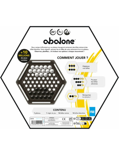 Grand classique du jeu abstrait pour deux, Abalone vous invite à tenter d'éjecter d'un plateau hexagonal six billes de votre adversaire en les poussant avec les vôtres.