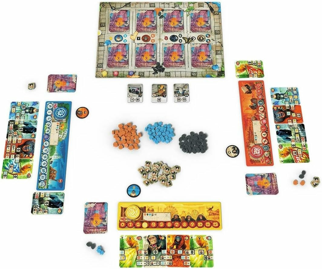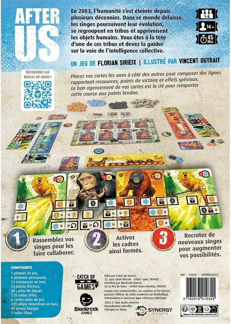 Pour l'emporter dans After us, vous devez atteindre 80 points de victoire avant vos adversaires. À chaque tour, tous les joueurs vont simultanément piocher les 4 premières cartes de leur deck puis les assembler, de gauche à droite, pour former des cartouches d'activation. Ils vont ensuite résoudre ces cartouches, un par un, de gauche à droite, pour gagner des ressources, des points de victoire ou activer les capacités spéciales de leurs primates. Tout le sel du jeu consiste donc à réaliser son assemblage judicieusement, en fonction de ce qu'on souhaite obtenir des cartes que l'on a piochées. Une fois cette phase d'activation résolue, tous les joueurs ont la possibilité d'ajouter un nouveau singe à leur tribu : chimpanzé, gorille, mandrill ou orang-outan. Ce choix dépend autant de leurs capacités spécifiques que des ressources dont disposent les joueurs.