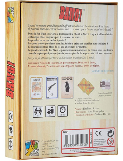 Avant de s'affronter dans d'implacables duels, les joueurs reçoivent une carte personnage comprenant les caractéristiques et les points de vie de leur personnage.À chaque tour, les joueurs piochent deux cartes puis jouent autant de cartes qu'ils le souhaitent. On ne peut toutefois jouer qu'une carte Bang par tour et activer une seule arme à la fois.