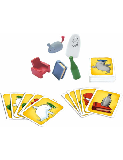 Pour les pièces en bois : la bouteille est verte, le fantôme est blanc, le fauteuil est rouge, le livre est bleu et la souris est grise ! Mais sur les cartes, toutes ces couleurs se mélangent… Il y a 2 objets sur chaque carte, et dès que l’une d’elle est retournée, il s’agit d’être le plus rapide à choper le bon objet : si la carte présente un objet de la bonne couleur, il faut vite l’attraper ; mais si les 2 objets représentés ne sont pas de la bonne couleur, alors il faut vite attraper l’objet qui n’a rien de commun avec la carte : ni l’objet, ni la couleur !