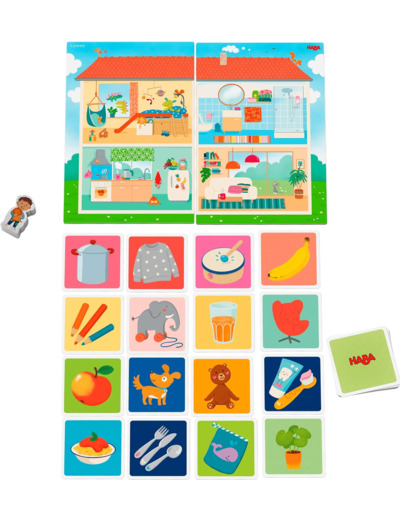 2 plateaux de jeu (imprimés recto verso) : la maison/ les pièces de la maison, 1 figurine (imprimée recto verso) garçon/fille, 32 cartes d'objets, 8 cartes de catégories (petit/grand ; léger/lourd ; intérieur/extérieur ; jour/nuit) ; 1 règle du jeu.