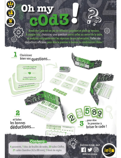 A 3 ou 4 joueurs, vous devez être le premier à identifier le code caché au centre de la table. Il faudra donc trouver le code de chaque adversaire afin de pouvoir en déduire celui qui est dissimulé de tous ! Le jeu devient alors incroyablement tactique, car chaque joueur est tenu de répondre aux questions… même celui qui les pose ! Parviendrez-vous à obtenir des informations intéressantes sans trop dévoiler votre propre jeu ?