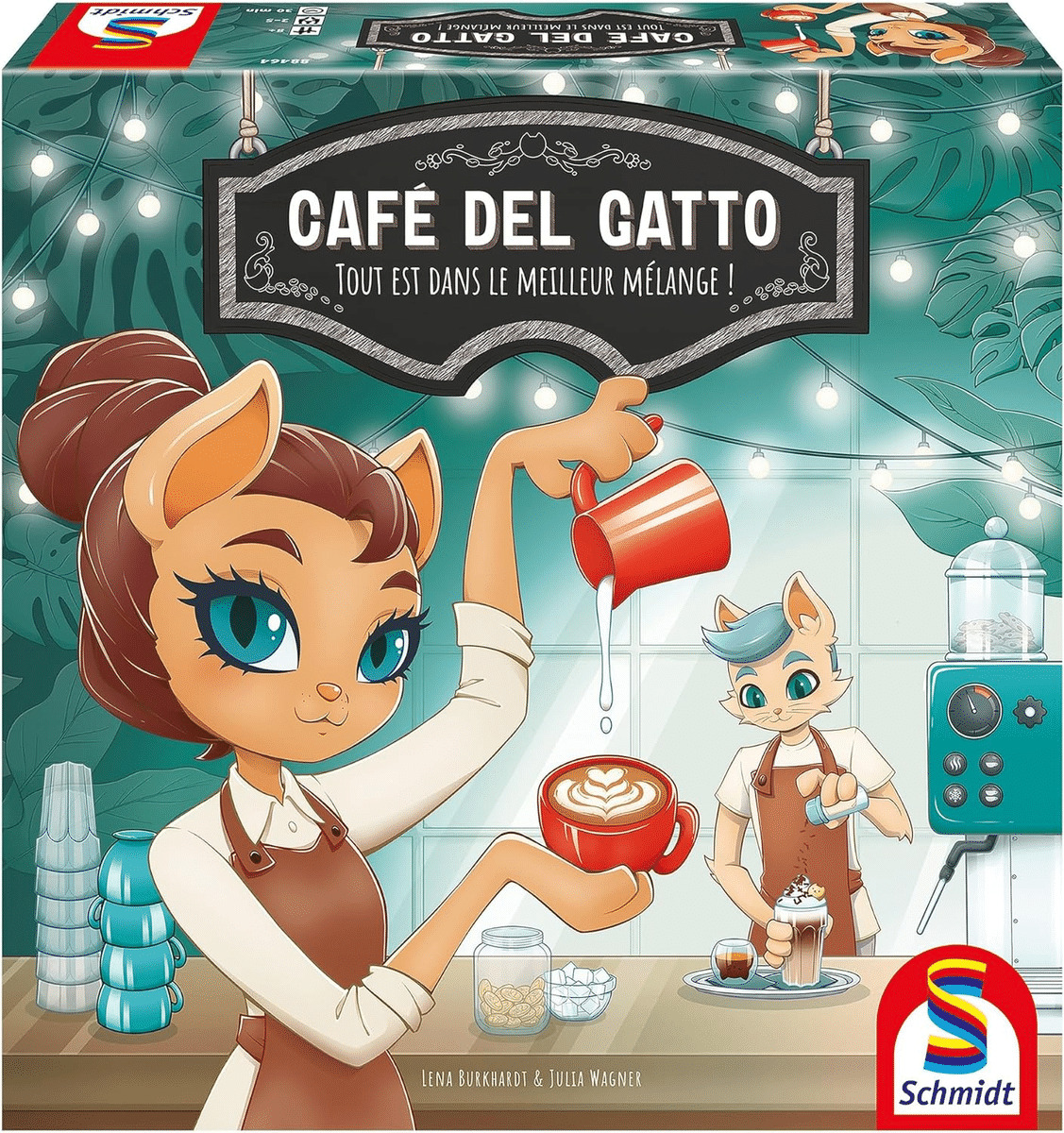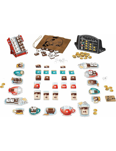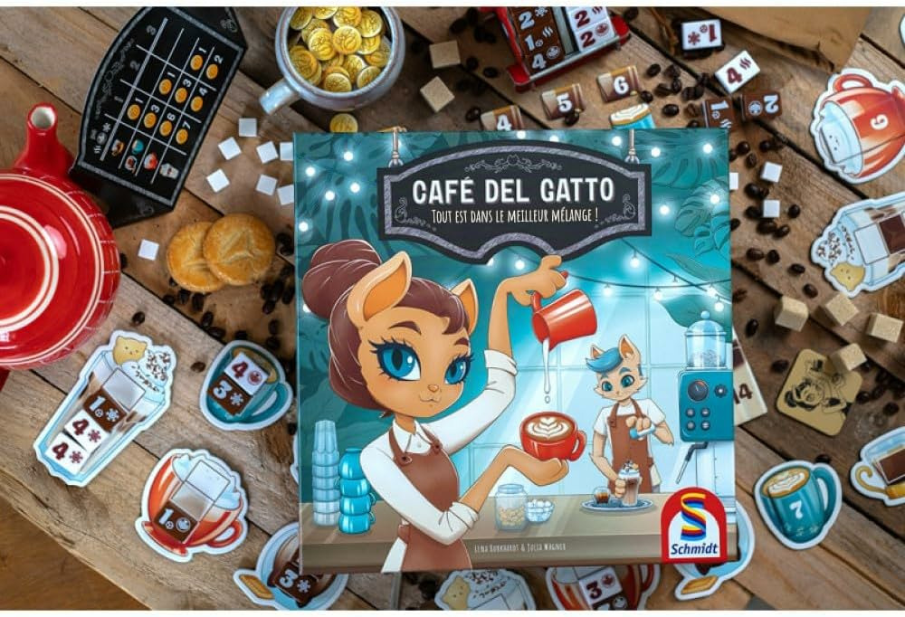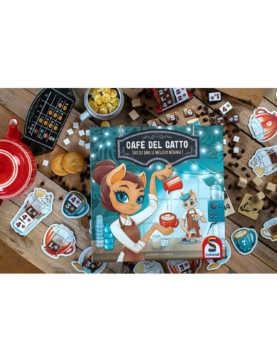 À votre tour, vous aurez le choix entre acheter une tuile café ou une tuile lait, revendre vos créations pour gagner de l'argent et des points de victoire ou passer votre tour pour gagner un peu d'argent. Cela peut paraitre simple mais il faudra surveiller en permanence l'avancée de vos adversaires. En effet, la fin de partie pourrait arriver bien plus vite que prévue. Café del Gatto est un jeu familial avec un système d'achat original et une interaction forte.