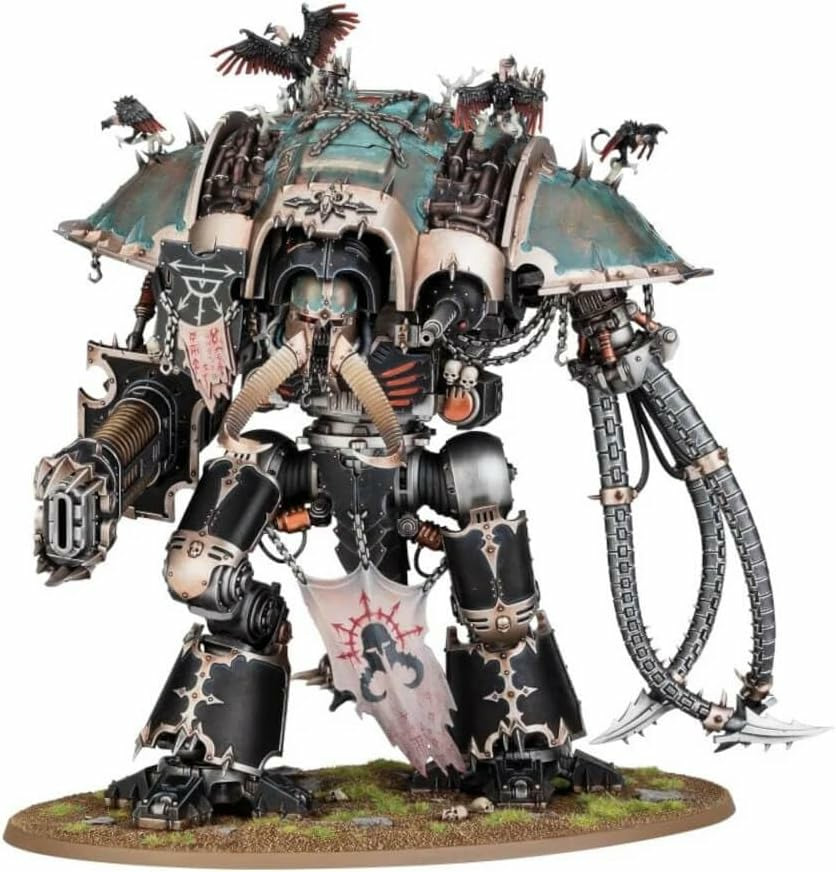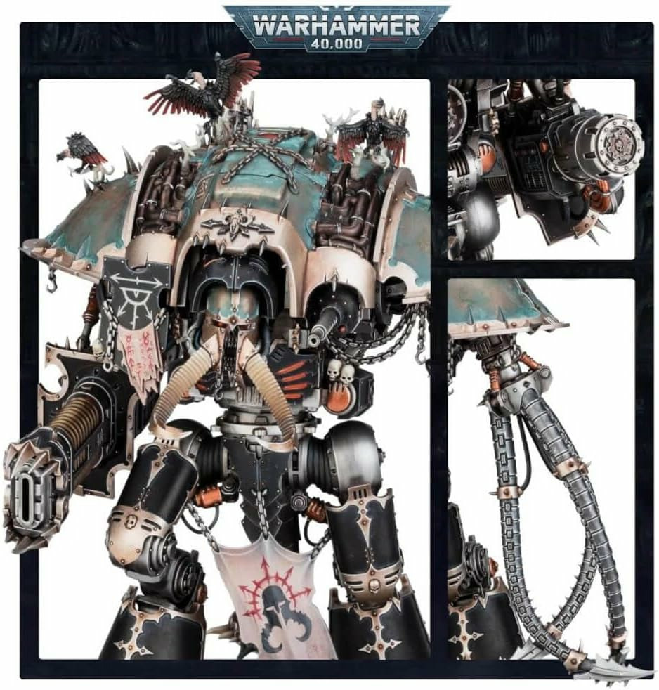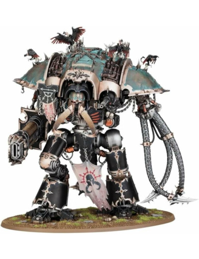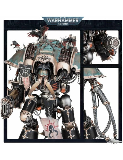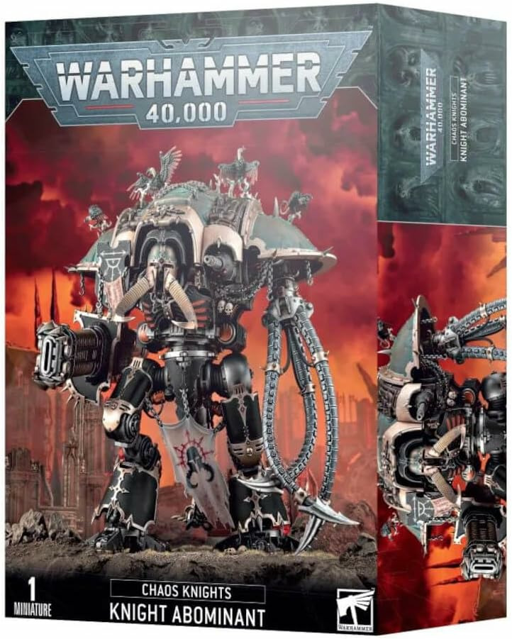 Ce kit se compose de 176 pièces plastique, et est fourni avec un socle ovale Citadel de 170mm. Il inclut aussi une feuille de décalcos Chevaliers du Chaos contenant 339 runes, signes et icônes de différentes Maisonnées de l'Infamie. Cette figurine est fournie non peinte et nécessite assemblage – nous recommandons d'employer la Colle Plastique Citadel et la peinture Citadel.