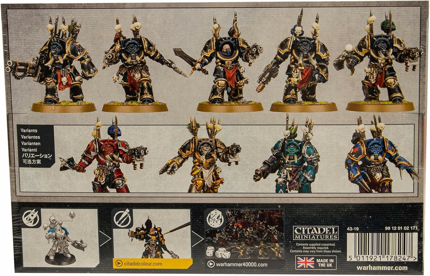 Le kit contient 5 Chaos Terminators multipièces en plastique, pouvant chacun être équipé de diverses armes de tir et de mêlée. Il propose les options suivantes: