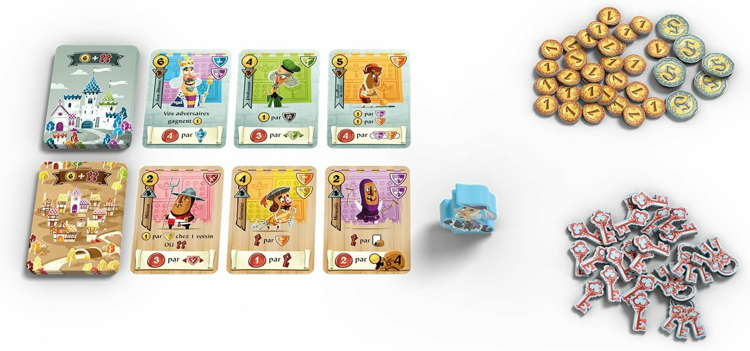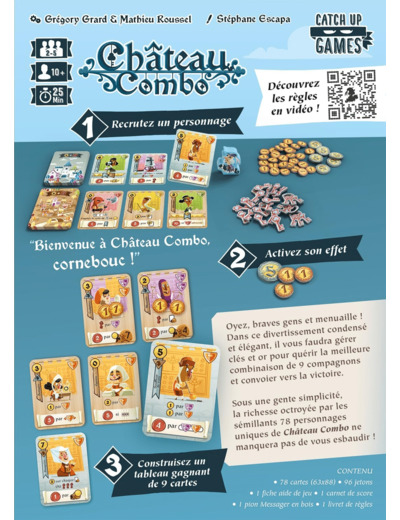 Château Combo est un jeu de construction de tableau dont la simplicité n’a d’égal que la richesse, procurant des sensations très gratifiantes ! Chaque tour, vous recrutez juste un personnage pour l’ajouter dans votre tableau, mais cette action très simple concentre énormément de décisions importantes : il faut gérer vos Clés afin d’influencer le pion Messager aux moments opportuns, car c'est lui qui détermine quels personnages peuvent être recrutés ; gérer votre pécule d'Or pour pouvoir payer le coût des personnages qui vous intéressent tout au long de la partie ; bien choisir vos personnages pour optimiser à la fois l'effet qu'ils déclenchent à l'achat et les points qu'ils vous rapporteront en fin de partie ; enfin, placer ces personnages judicieusement dans votre tableau de 3 par 3 pour en tirer le meilleur parti. Simple et riche, vous disait-on…
