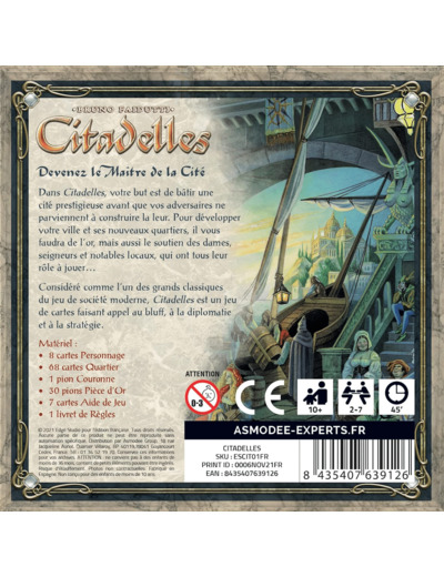Votre mission: construire 8 quartiers dans votre citadelle et optimiser cette construction pour qu'elle vous rapporte un maximum de points. Pour cela vous devrez choisir à chaque tour un personnage (roi, voleur, condottiere...) qui vous apportera de quoi surprendre vos adversaires ou vous avantager. Un excellent jeu mêlant tactique et bluff. La nouvelle édition contient : 67 Cartes quartiers ; 8 Cartes personnages ; 1 marqueur couronne ; 7 cartes d'aide de jeu ; 30 pièces (jetons)