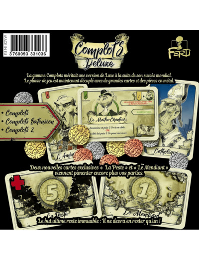 Contient Complots, Complots 2 et Complots extension Catholique et Protestant ainsi que 2 nouvelles cartes exclusives "La Peste" et "Le Mendiant".
