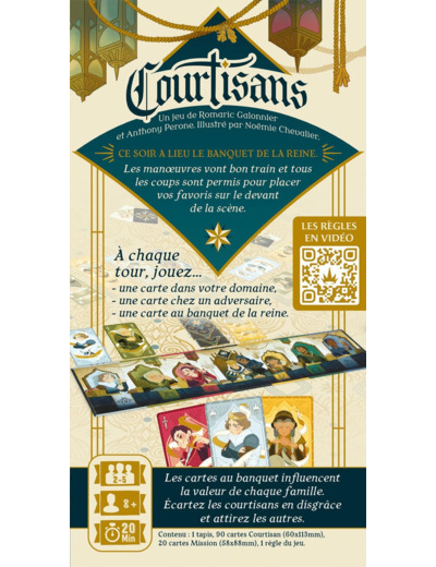 Les retournements de situations sont légions car certains Courtisans ont des rôles spécifiques. Des espions pourraient se glisser dans votre jeu et rendre l'issue incertaine. À moins que des assassins viennent vous retirer les cartes vous rapportant le plus. Pour obtenir le plus de points et l'emporter, vous devrez collectionner les bonnes familles tout en préservant leur valeur à la table de la reine.