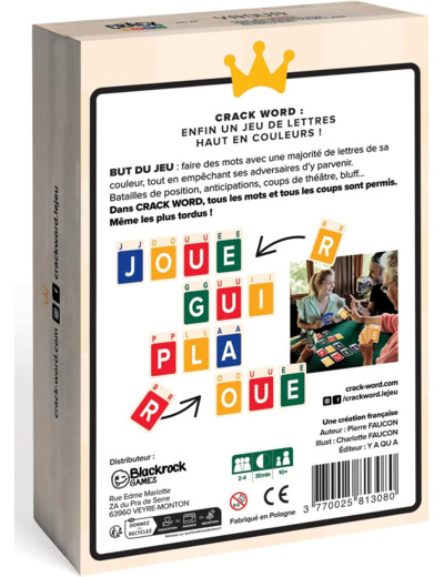 Le but du jeu dans CRACK WORD est de créer des mots en utilisant principalement des lettres de votre propre couleur tout en empêchant habilement vos adversaires de réaliser cet objectif. Ce jeu est une véritable arène de batailles de position, d'anticipations, de coups de théâtre et de bluff. Dans CRACK WORD, toutes les stratégies sont les bienvenues, même les plus retorses. Vous devrez faire preuve de créativité, de ruse et d'ingéniosité pour maximiser votre avantage tout en déjouant les plans de vos adversaires.