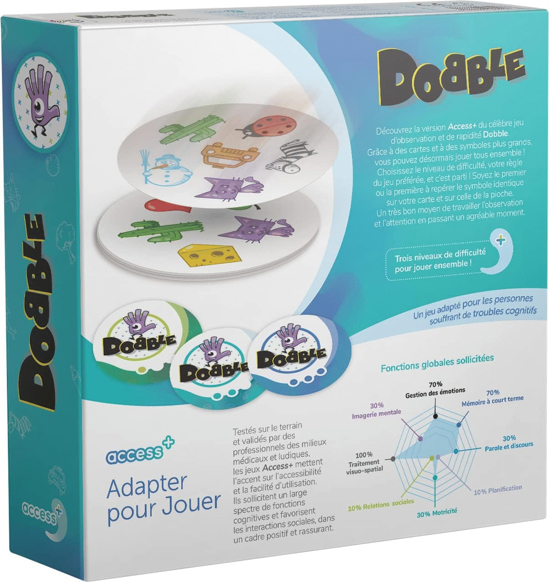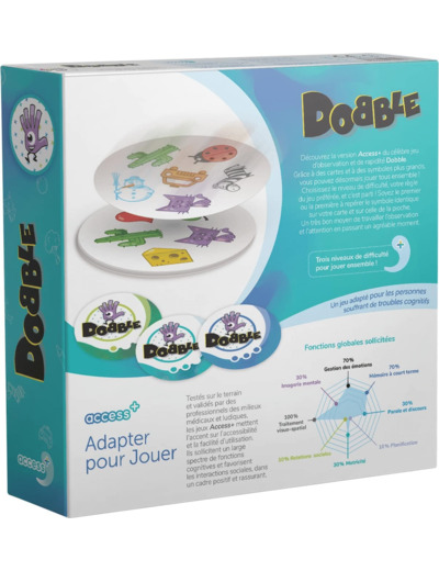 Dobble Access+ sollicite particulièrement l’attention, l’observation, la rapidité, la mémoire et la motricité.