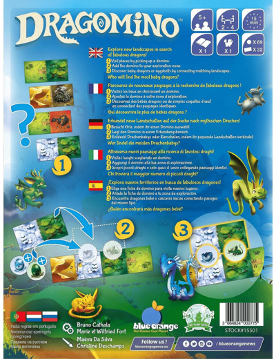 Bienvenue sur l'île de Dragomino dont nous allons explorer les paysages à travers les dominos du jeu (forêts, plaines, déserts, etc.). Et bien sûr de nombreux œufs de dragons, chaque famille de dragons étant associée à un type de paysage. A chaque tour, on retourne 4 tuiles puis on en choisit une qu’on place devant soi. On va peu à peu les associer et lorsqu'on a une paire de paysages identiques (deux forêts, par exemple), on pourra piocher un œuf de dragon correspondant et le placer à la jonction de ces 2 dominos.