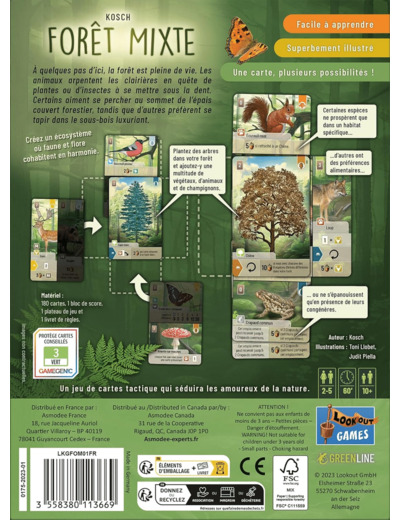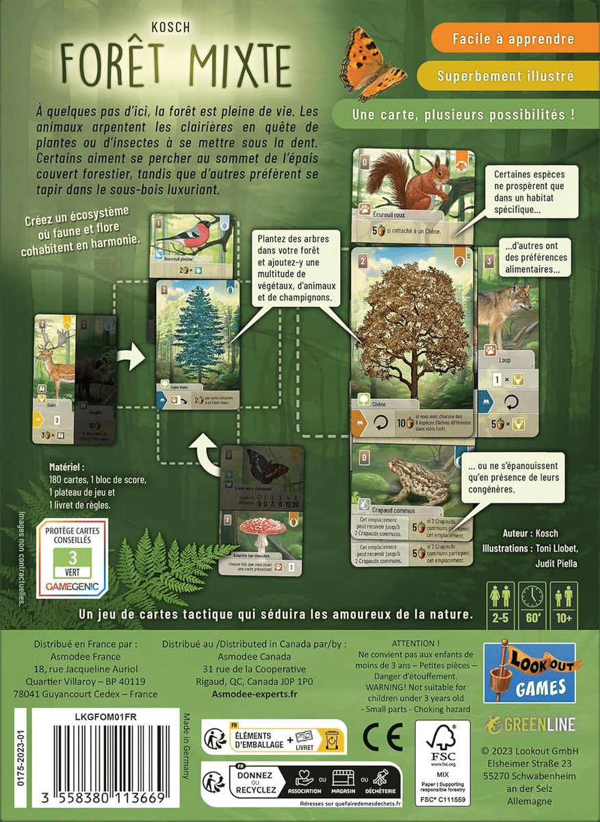 Préparez-vous à créer un écosystème où faune et flore cohabitent en harmonie. Posez des cartes Arbre de votre main, puis jouez vos cartes flore et faune, en glissant la moitié supérieure, inférieure, droite ou gauche sous votre carte arbre ! Pensez à respecter leurs préférences pour marquer un maximum de points !