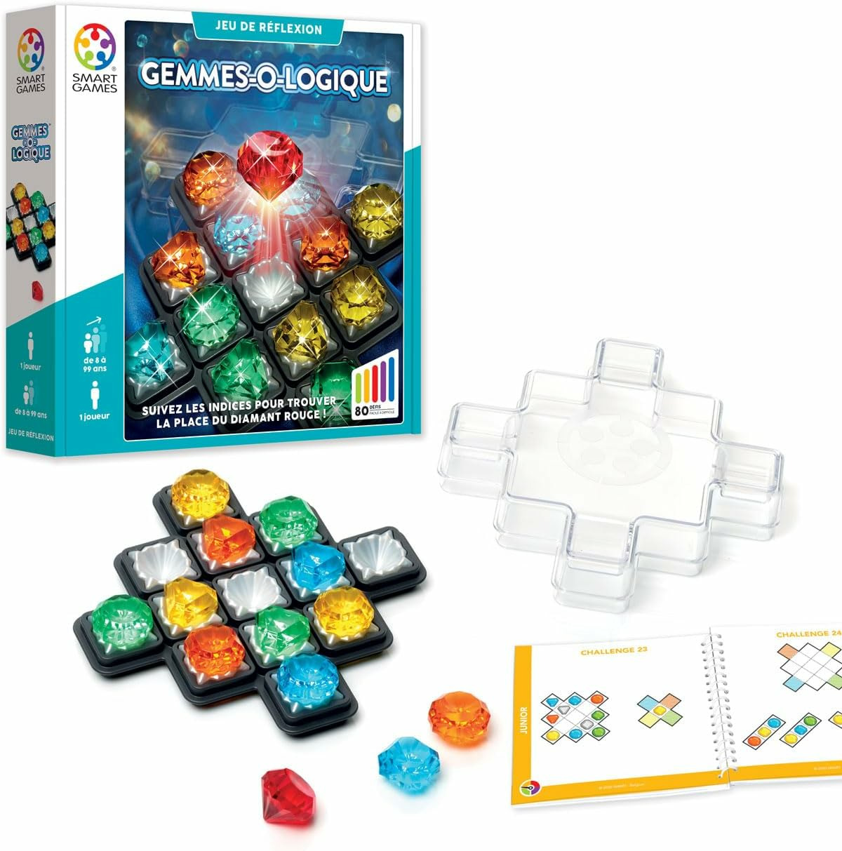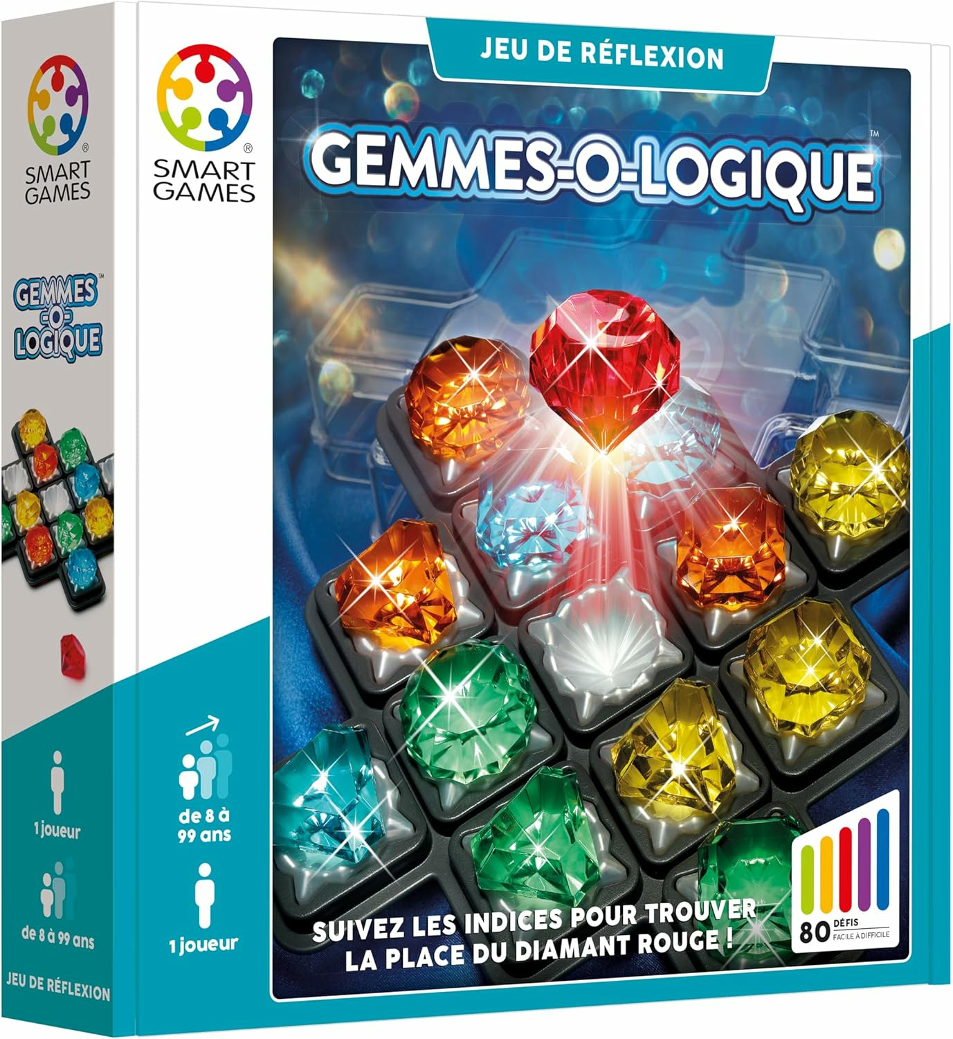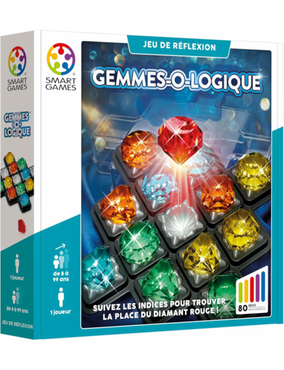 Entrez dans la mine de diamants SMARTGAMES, déterrez toutes les gemmes et trouvez la position du diamant rouge. Pour chaque défi, aidez vous de la “mine” d’informations offertes par les indices. Plus vous creusez, plus vos capacités de déduction seront mises à l’épreuve ! Gemmes-o-logic est un jeu de réflexion unique qui comporte 80 défis, du plus facile au niveau expert.