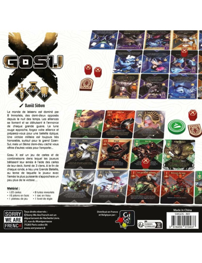 Gosu X est un jeu de cartes et de combinaisons où les joueurs construisent leur armée à l'aide des cartes de leur deck. Ce deck est formé de 3 clans choisis en début de partie via une phase de draft. Et les 2 clans non choisis modifient les règles du jeu ! Une partie se déroule en 3 manches maximum.