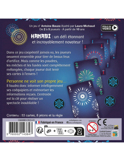 Les joueurs incarnent des artificiers qui coopèrent afin de composer 5 feux d’artifice de couleurs différentes. La petite subtilité d’Hanabi est que les joueurs ne peuvent à aucun moment consulter leurs cartes, qu’ils prennent en main tournées vers leurs camarades. Ainsi chacun connait tous les jeux des autres mais pas le sien.