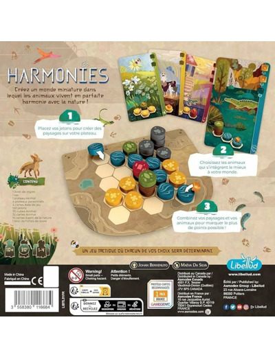 Dans Harmonies, construisez un paysage sur votre plateau en posant des séries de 3 pions et faites apparaitre des forêts, des montagnes, des champs et des villes.