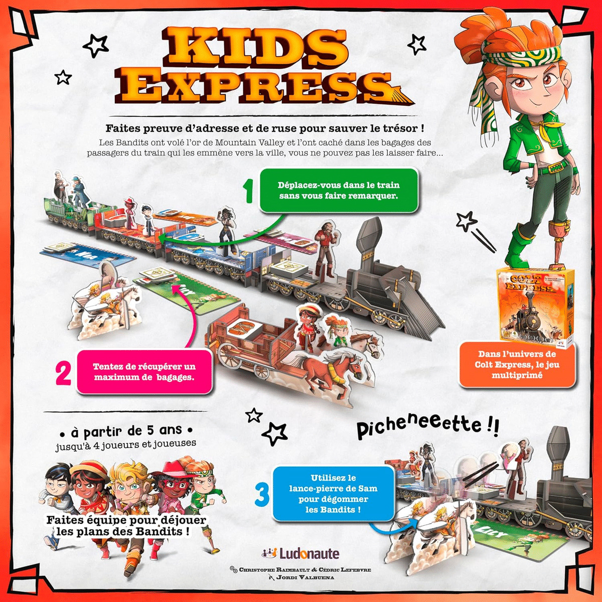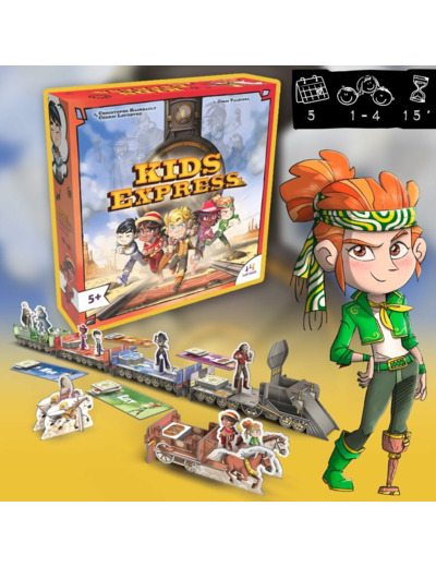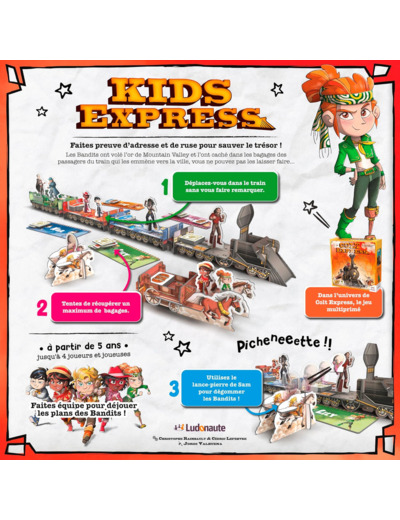 C’est au tour de vos enfants de jouer dans l’univers de Colt Express. Ils incarnent des enfants et leur mission est de retrouver le trésor volé par les vilains Bandits. 1) Décidez SOIT de vous déplacer dans le magnifique train 3D SOIT de dégommer un Bandit. Posez alors le projectile sur la plateforme prévue à cet effet et donnez un coup de pichenette pour le faire voler. Touché, le Bandit retourne dans son Repaire. 2) Ramassez un bagage et appliquez l’un des quatre effets indiqué au dos. Les Bandits se déplacent, ramassent des Bagages, vous éjectent du train... La partie s’arrête immédiatement dès qu’une pile de Bagages du train est VIDE. Formez alors deux piles, une composée des bagages récupérés par tous les enfants et l’autre avec ceux des Bandits. La pile avec le plus de Bagages l’emporte et donne la victoire à l’équipe qui l’a constituée.