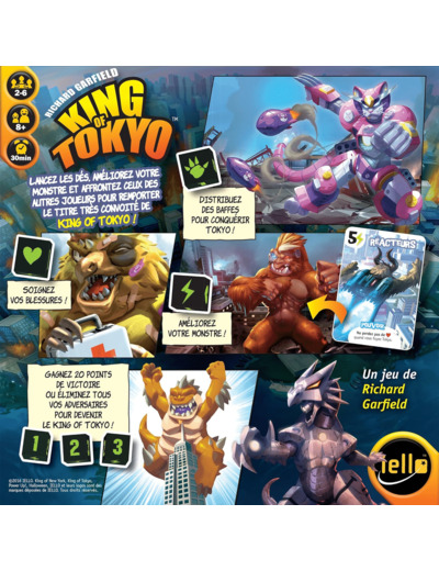 Lancez les dés, faites les meilleures combinaisons possibles afin de vous soigner, d'attaquer, d'acheter des cartes ou de gagner des Points de Victoire. A vous d'adapter la meilleure stratégie pour devenir le King of Tokyo au bon moment et attaquer tous vos adversaires en même temps...