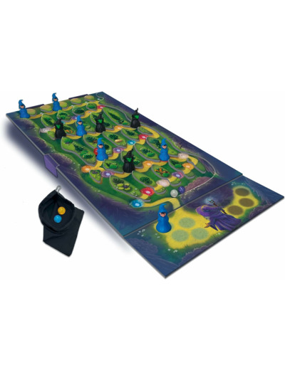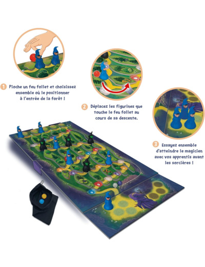 Suivez les feux follets à travers les chemins sinueux de la fôret. Faites descendre les billes en déplaçant chaque figurine qu'elles touchent vers le point de couleur suivant jusqu'à ce que la bille arrive tout en bas. Puis piochez une autre bille et recommencez. Si les apprentis arrivent près de l'enchanteur avant les sorcières, c'est gagné !