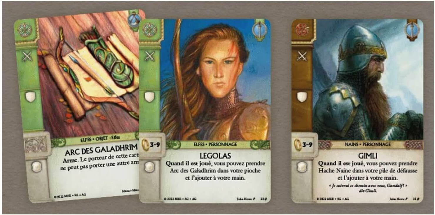 Chaque joueur possède son propre paquet de cartes, représentant les forces et les faiblesses des factions impliquées dans la guerre. Pour gagner, il va falloir se focaliser sur votre objectif mais aussi surveiller les actions de vos adversaires. Pendant une manche, vous alternez les tours en jouant des cartes représentant des personnages, des armées, des objets et des événements de la Guerre de l’Anneau. À la fin de chaque manche, les combats entre les cartes opposées sur le même champ de bataille et les routes sont résolus. Vous gagnez des points de victoire en remportant des combats.