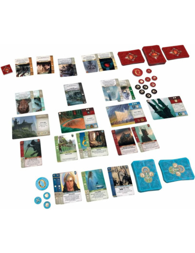 Contenu : 120 cartes de factions, 41 cartes de Lieux, 41 pions (premier joueur, Anneau, combat et corruption), 1 marqueur d’ordre du tour, 1 piste d’ordre du tour, 4 aides de jeu, 1 livret de règles.