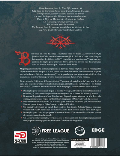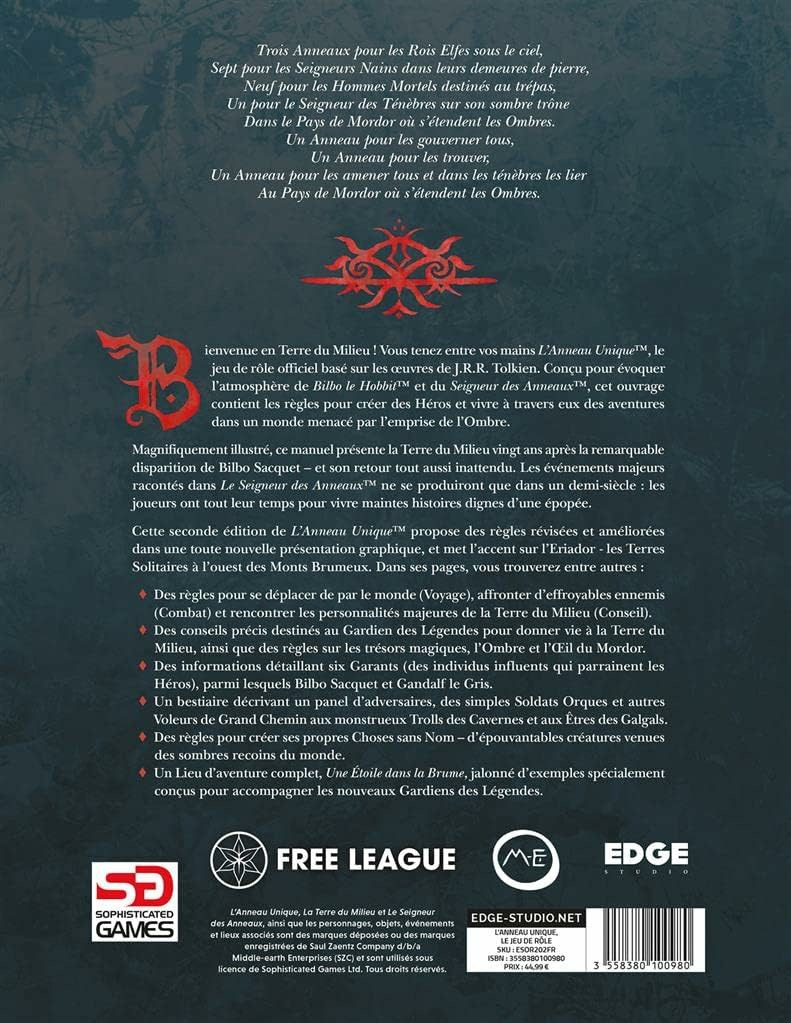 L’Anneau Unique™, le jeu de rôle officiel basé sur les œuvres de J.R.R. Tolkien, contient les règles pour créer des Héros et vivre à travers eux des aventures dans un monde menacé par l’emprise de l’Ombre.