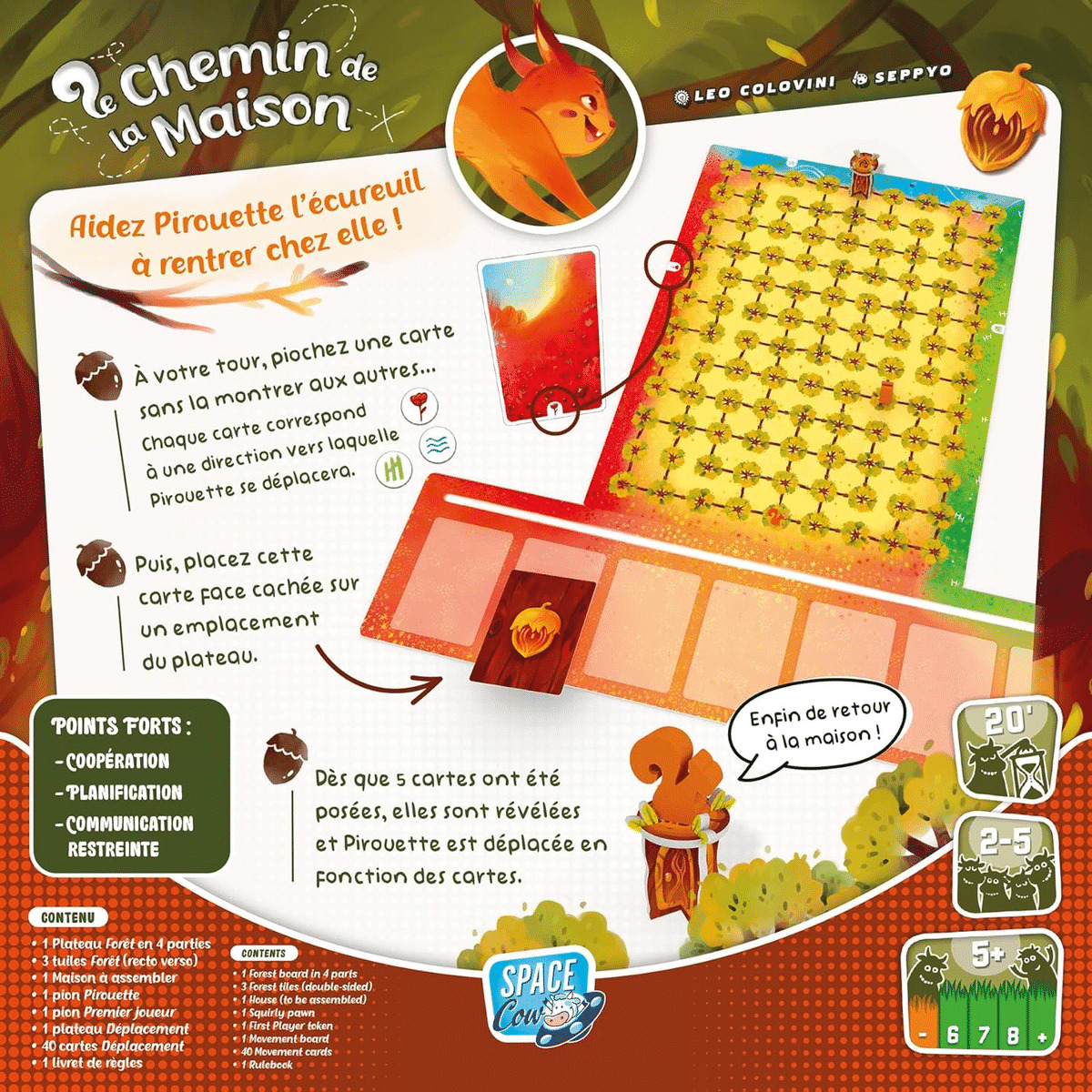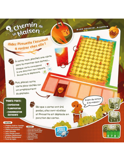 À son tour, le joueur pioche la première carte sans la montrer à ses camarades puis la place, face cachée, sur l’un des 7 emplacements de la piste de programmation. Quand 5 cartes ont été posées, Pirouette se déplace. On retourne, faces visibles, les cartes une par une, en partant de la gauche. Chacune permet de se déplacer vers la droite, la gauche, le haut, ou même de sauter sans se préoccuper d’une liaison entre deux cases. Si un déplacement ne peut être fait, car la liaison nécessaire n’existe pas, une carte est retirée de la pioche ! Il faut parvenir à la maison de l’écureuil avant l’épuisement de la pioche.