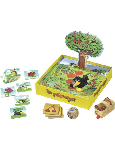 L’élégant cerisier en 3D croule sous les fruits délicieux, que les joueurs doivent cueillir avant que l’effronté corbeau n’arrive pour voler les fruits. Le dé de couleur captivant indique si l’on peut mettre des cerises dans le panier à fruits ou si le corbeau approche. Le superbe jeu Le petit verger stimule la mémoire, la reconnaissance et la désignation des couleurs et contribue au développement du sens du collectif.