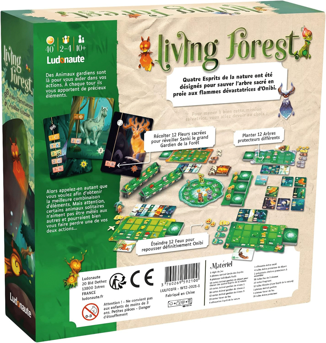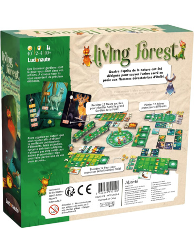 Dans Living Forest, vous jouez un Esprit de la nature désigné pour tenter de sauver la forêt et son Arbre sacré des attaques incessantes d’Onibi. Il y a trois manières de réussir cette tâche : en plantant 12 Arbres protecteurs différents, en récoltant 12 Fleurs sacrées pour réveiller Sanki le grand Gardien de la Forêt ou en éteignant 12 Feux pour repousser définitivement Onibi.