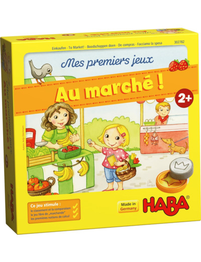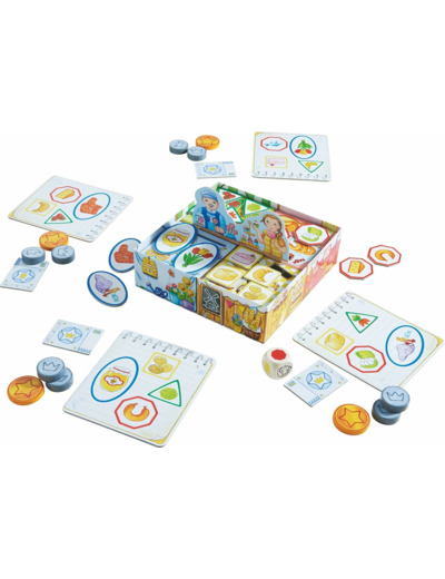 Contenu: 1 étal (= fond de la boîte avec partie à insérer, plateau de jeu et décor vertical à emboîter), 8 petites pièces avec une couronne, 4 grosses pièces avec une étoile, 4 billets HABA, 16 plaquettes de produits (dans 4 catégories), 4 listes de courses, 1 dé, 1 règle du jeu.
