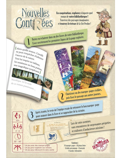 Nouvelles Cont(r)ées est un jeu coopératif qui se joue dans n’importe quel livre de votre bibliothèque ! Oui, il se joue dans un livre ! Pas de plateau supplémentaire, vos ouvrages deviennent votre nouveau terrain de jeu. C’est un jeu surprenant, riche en ambiance, et avec un sacré goût de reviens-y. Et c’est aussi un voyage poétique et une exploration de l’imaginaire, attachante, drôle et rafraîchissante.