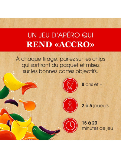 Paquet de Chips est un jeu d'ambiance dans lequel, à chaque manche, vous pariez sur les chips qui seront piochées. Choisissez les bonnes cartes! Certaines vous feront gagner des points...et d'autres en perdre.