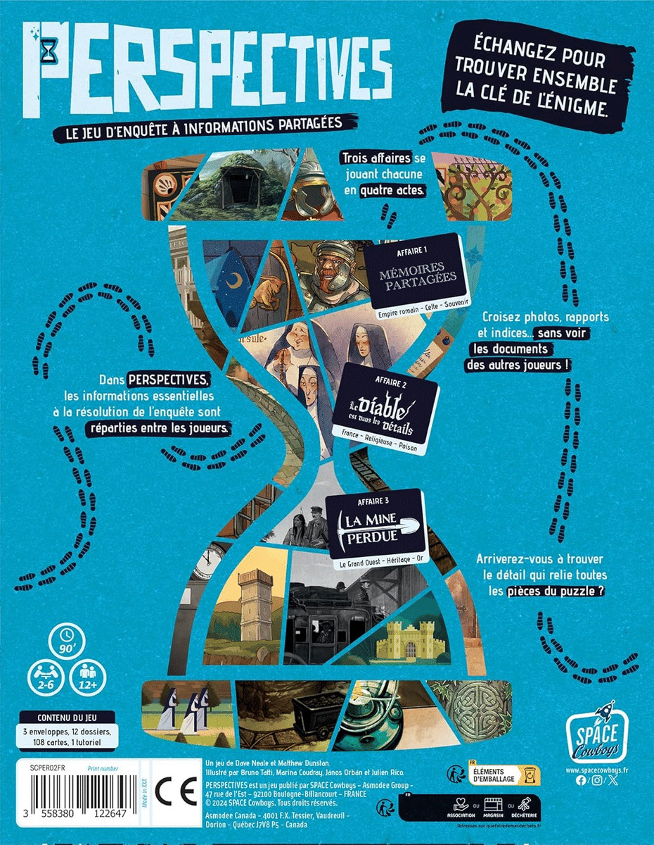 Jouez les détectives et résolvez les affaires en coopérant… dans les limites imposées par le jeu. Dans Perspectives, les enquêtes se résolvent grâce à des photographies, rapports et autres indices dessinés sur des cartes. Mais chaque joueur possède des éléments et il lui est strictement interdit de les montrer aux autres. À vous de discuter, d’échanger, d’expliquer, de décrire, afin de relier les éléments entre eux et de percer les mystères de ces trois nouvelles affaires.