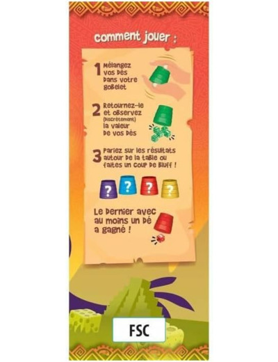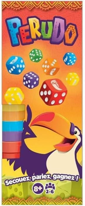 Chacun dispose de 5 dés sous son gobelet. Tour à tour vous devez enchérir sur la proposition de votre voisin, en estimant le nombre de dés d'une certaine valeur. A vous d'associer estimation, bluff et chance pour devenir le roi du Perudo