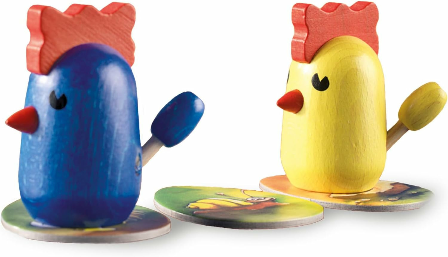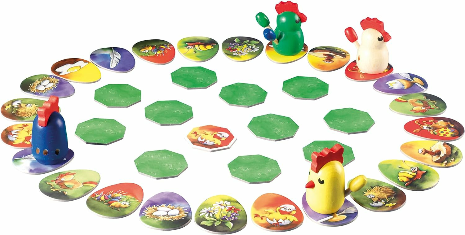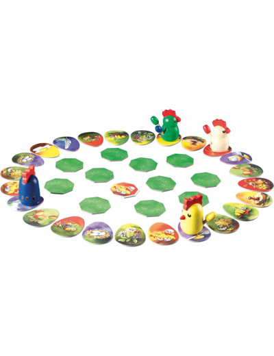 Case après case, 4 poules en bois cherchent leur chemin en retournant, au centre du parcours, la carte cachée correspondant à la case suivante. Une bonne mémoire vous permettra de déplumer toute la basse-cour !
