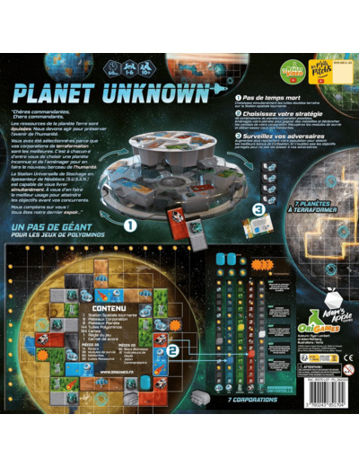 Développez une planète inconnue à l’aide de polyominos. A chaque tour, placez une tuile de développement sur votre planète. Les tuiles comportent deux des six terrains qui représentent l’infrastructure nécessaire pour soutenir la vie sur la planète. Augmentez vos pistes de ressources pour compléter un maximum de lignes et de colonnes sur votre planète pour marquer des points de victoire.