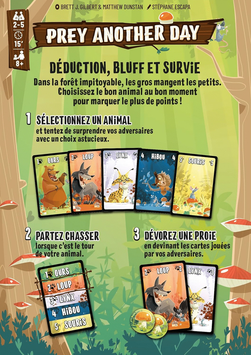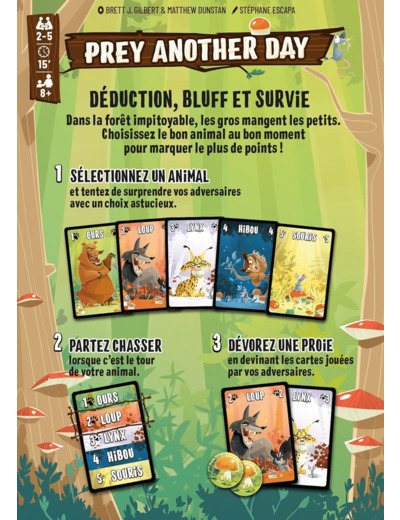 On résout chaque animal et nous lançons une seconde chasse avec les survivants. S’il reste plusieurs survivants à la fin de la troisième chasse. Ce sont les points sur les cartes qui départagent les joueurs. (Ours 1 ; Loup 2…)