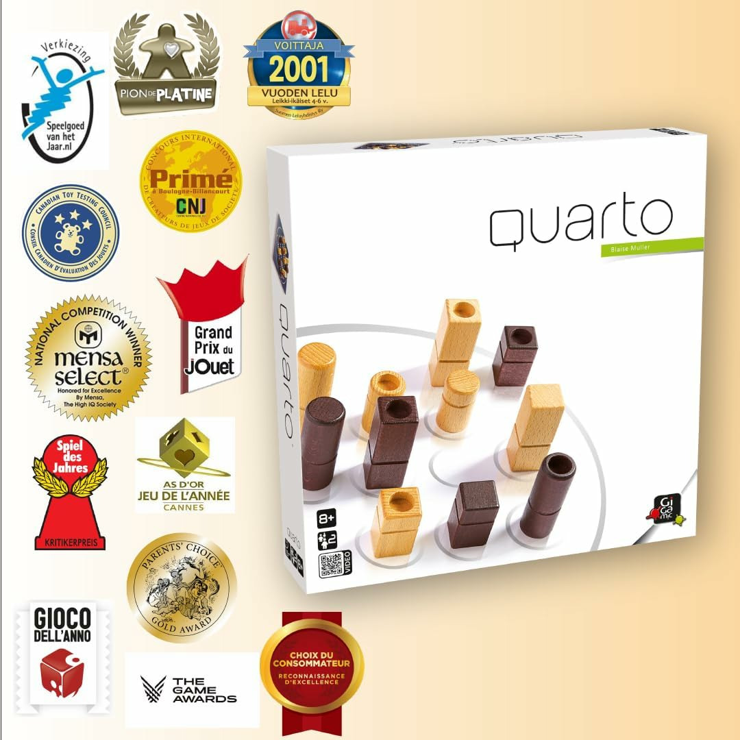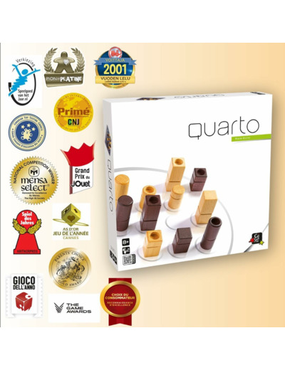 Les seize pièces du jeu, toutes différentes, possèdent chacune 4 caractères distincts : haute ou basse, ronde ou carrée, claire ou foncée, pleine ou creuse. Chacun à son tour choisit et donne une pièce à l'adversaire, qui doit la jouer sur une case libre. Le gagnant est celui qui, avec une pièce reçue, crée un alignement de 4 pièces ayant au moins un caractère commun et annonce : «QUARTO !».