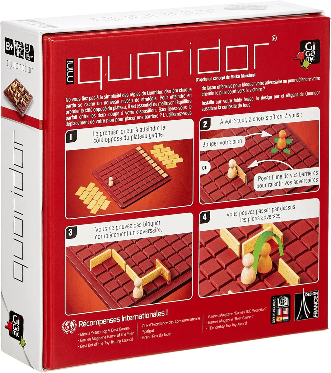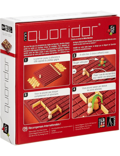 Votre problème : l'adversaire pose des barrières pour vous ralentir ! Rassurez-vous : il doit vous laisser au moins un passage libre. Mais qui aura le chemin le plus court ? Un jeu captivant et vraiment drôle, accessible à tous. Les joueurs se partagent les barrières et chacun pose son pion au centre de sa ligne de départ. A tour de rôle, chacun déplace son pion d'une case, ou pose une barrière afin de ralentir l'adversaire. Les pions doivent contourner les barrières, qui créent un labyrinthe dont il faut sortir très vite, car le premier qui atteint la ligne opposée à sa ligne de départ a gagné !