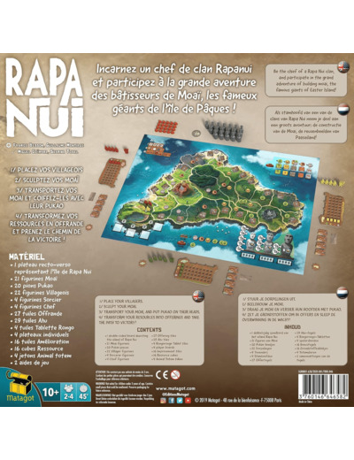 Chaque tour de jeu se déroule en 3 phases. Lors de la première phase, chaque joueur envoie un de ses figurines sur le plateau, chacun son tour, jusqu’à ce que toutes les figurines aient été placées. Le sorcier décidera de l’ordre du prochain tour, et les villageois sont placés sur le plateau pour devenir des transporteurs ou sculpteur. Grâce au nombre des sculpteurs présents dans la Carrière, chaque joueur récupère des Moaïs de différentes tailles. Les Moaï ou Pukao doivent être transportés grâce à une chaîne continue de transporteurs, qu’ils soient de votre clan ou pas. Mais attention, vous rapportez à vos adversaires une ressource par transporteur utilisé ! Une fois arrivé à destination, vous pouvez ériger le Moaï, pour prendre la tuile Ahu à jouer à n’importe quel tour, ainsi qu’une ou plusieurs Ressources selon la taille du Moaï. Coiffez vos Moaïs vous permettra de transformer vos ressources en tuiles Offrande. Si, à la fin d’un tour, il reste autant ou moins d’ahus inoccupés par des Moaï que le nombre de joueurs, la partie s’achève. Le gagnant est le joueur avec le plus de points de victoires gagnés grâce aux tuiles Offrande et Offrande exceptionnelle.