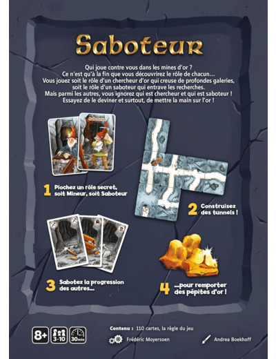 Vous jouez soit le rôle d'un chercheur d'or qui creuse de profondes galeries, soit le rôle d'un saboteur qui entrave les recherches. Mais parmi les autres joueurs, vous ignorez qui est chercheur et qui est saboteur ! Essayez de le deviner pour savoir qui soutenir...