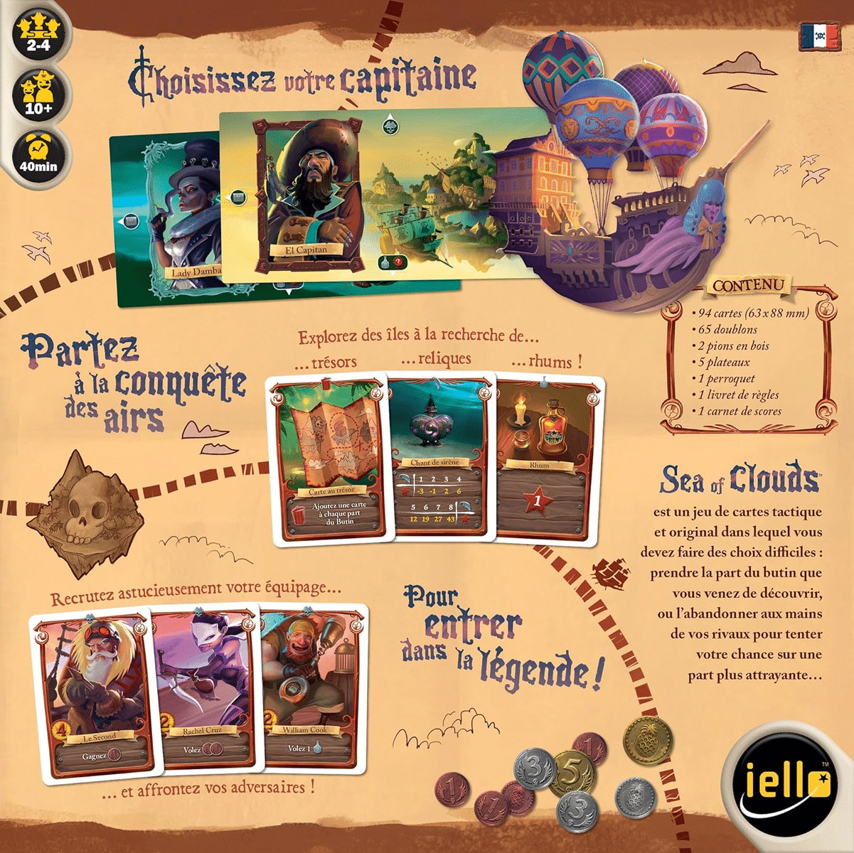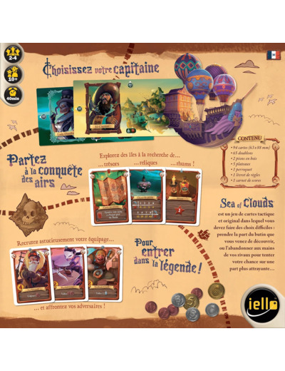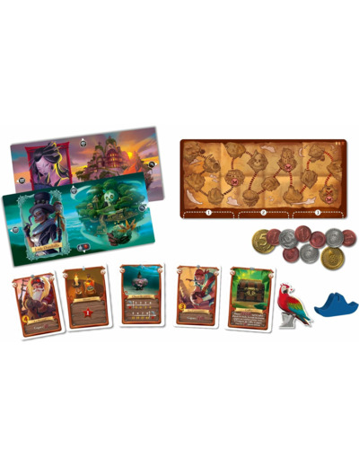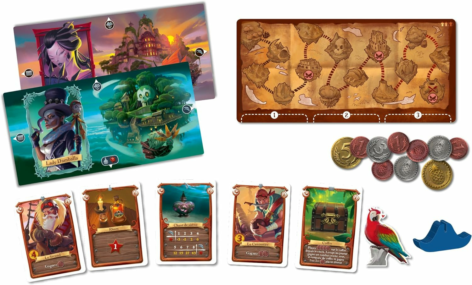 Vous pourrez ainsi dénicher du rhum, recruter des pirates, collecter des reliques et autres objets précieux. Composez votre main judicieusement et préparez-vous au combat, car lorsque les bateaux volent les uns près des autres, il vous faudra partir à l’abordage pour utiliser les effets de vos pirates. Gagnez des doublons, pillez les trésors de vos adversaires et amassez le plus de points de victoire pour être le grand vainqueur de cette bataille.