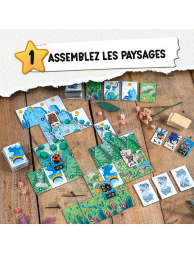 La mécanique de capture de tuile est tirée de la mécanique du hanafuda. Récupérez une tuile en fonction de la colonne ou de la rangée puis placez les dans votre paysage. Le but du jeu sera de reconstituer un paysage en associant ses tuiles pour faire un maximum de points. Il faudra faire attention à ne pas laisser de tuiles à l'adversaire tout en optimisant son paysage selon les choix de celui-ci. Aussi, créez des carrés de tuiles pour récupérez des esprits qui vous aideront en cours ou en fin de partie. L'expérience est... zen et très rapide à mettre en place ! Pour les grands et les petits !