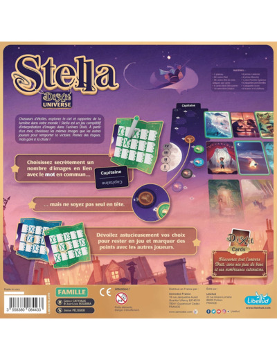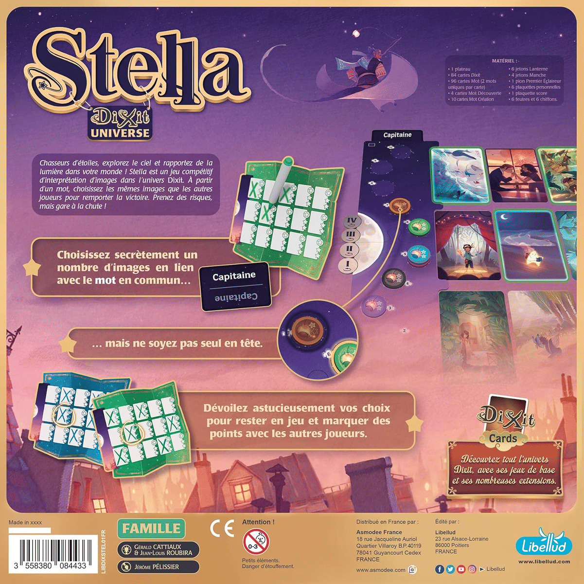 Stella est un jeu compétitif d’interprétation d’images qui explore une nouvelle approche de l’univers Dixit. À partir d’un mot, trouvez des associations entre ce dernier et des cartes Dixit révélées aux yeux de tous. Pour marquer des points, choisissez les mêmes images que vos adversaires : plus vous en avez, mieux c’est. Il vous faudra prendre des risques pour l’emporter, mais ne tentez pas de monter trop haut dans les étoiles car plus lourde sera la chute !