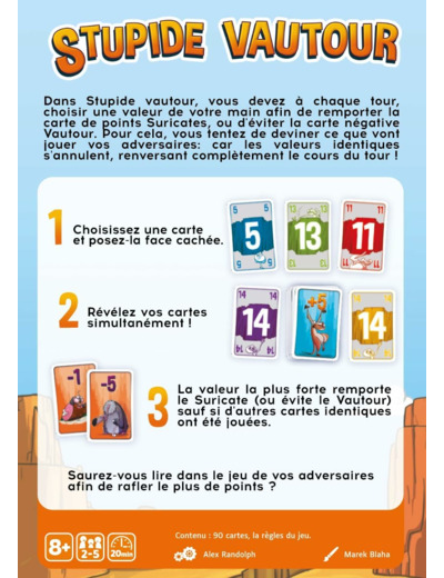 Au départ les joueurs ont tous les mêmes cartes en main. À chaque tour, un Suricate (valeur positive) ou un Vautour (valeur négative) est mis en jeu. Tous les joueurs posent alors une carte de leur main, face cachée, puis la retournent simultanément. Pour gagner des points, ou éviter d’en perdre, il faudra avoir joué la carte la plus élevée. Mais attention, quand deux joueurs ou plus posent une carte de même valeur, ces cartes sont immédiatement défaussées... pour le plus grand bonheur de leurs adversaires ! Il s’agit donc d’essayer de deviner quelle carte vos adversaires vont poser.