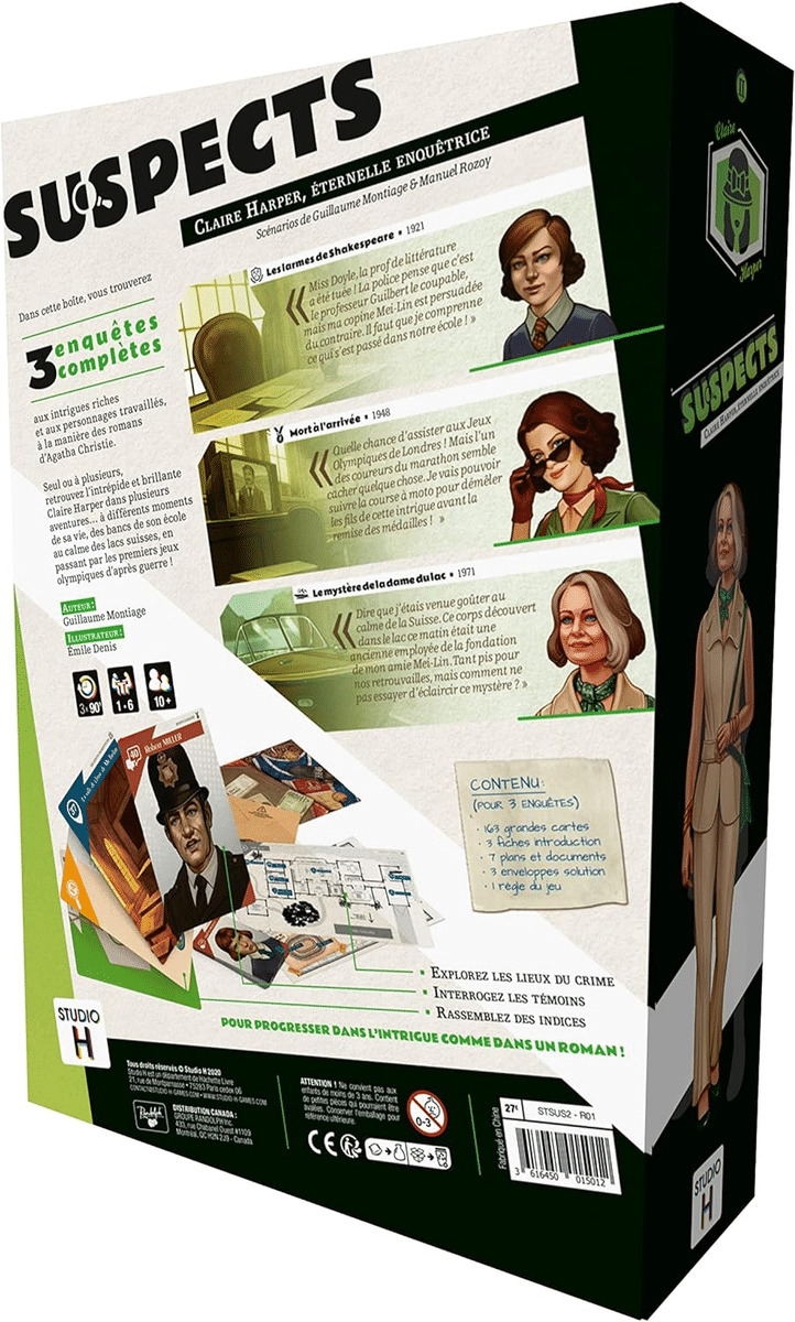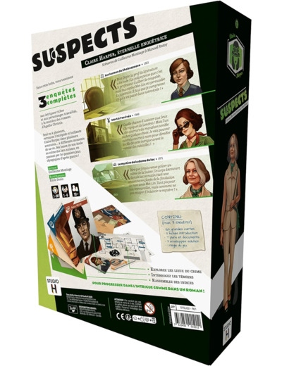 Suspects est une série de jeu d’enquêtes et de réflexion avec des règles minimales, et centrée sur les personnages à la manière des romans d’Agatha Christie. Chaque boîte est axée sur un enquêteur et une époque, et propose 3 scénarios avec des personnages bien travaillés et des intrigues solides.